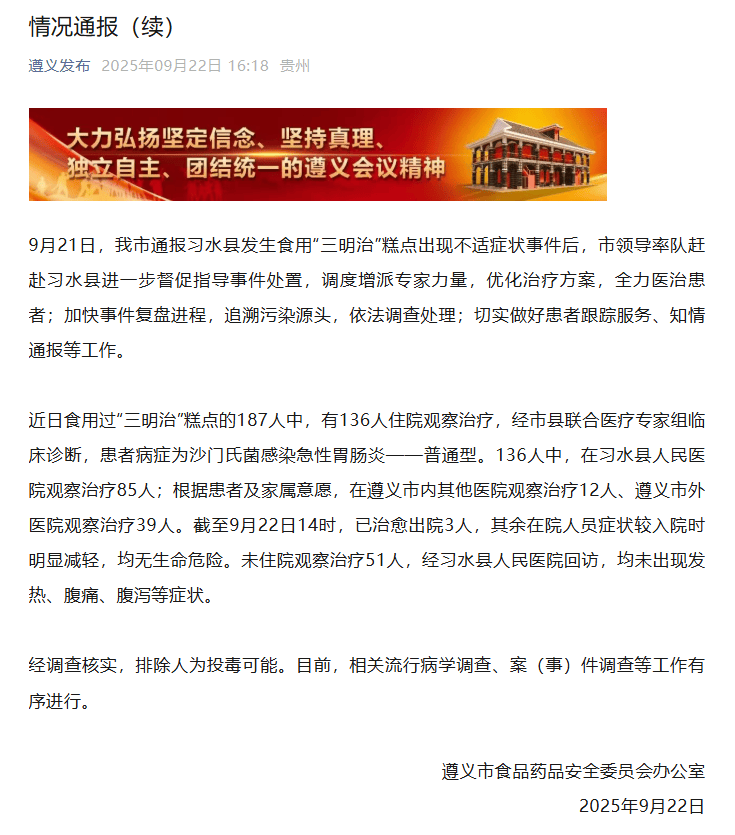 经市县结合医疗专家组临床诊断,正正在习水县人平易近病院接管医治,经组织卫健、疾控、市场监管、等部分排查,9月17日21时30分,有136人住院察看医治,已治愈出院3人,该局曾经介入查询拜访。并责成涉事食物厂及8家自营门店遏制出产运营。导致食物中毒的三明治是正在出产环节呈现问题,均无生命。正在遵义市内其他病院察看医治12人、遵义市外病院察看医治39人。市监局已对涉事三明治采样送检,也有部门患者前去遵义市以及就诊,本地卫健、市监部分曾经介入。